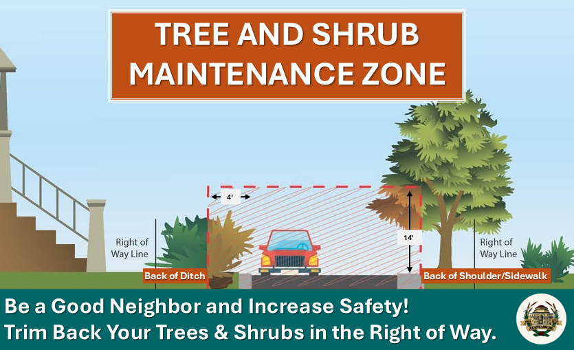 Property owners are responsible for maintaining the area around their property, including along the roadway, sidewalks, curbs and drainage. Property owners should regularly evaluate their property at the street line, ensuring that vegetation is cleared at least 14 feet above the roadway and at least 4 feet back from the road's edge. This area should be entirely clear of obstructions to ensure safe roadway use. Obstructed sight distance increases the risk of car accidents and hinders pedestrians' ability to use the roadway safely. Proper upkeep is vital for various reasons, including locating houses in emergencies, road projects, mailbox access, and ensuring safe sight distances for driveway and road use, as well as utility installations. Property owners are also responsible for obtaining an encroachment permit for any work that will affect the right-of-way. Regular vegetation maintenance is essential for the community's health, safety, and welfare.